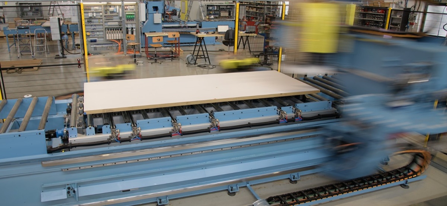 This version uses a special work table combined with driving rollers and suction cups which, after having transported the piece to be worked, block it for the operations to be carried out and then unload it and take it out of the area, leaving the place free for a new piece. The system is supported by dedicated software to autonomously transmit to the Machining Center the operations to be carried out on the incoming material, even different ones, from time to time. The right answer for in-line production.